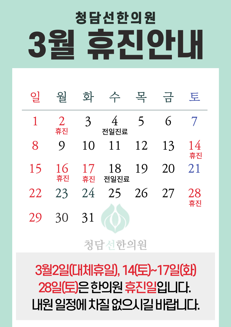 3월 2일(월, 대체휴일)과 3월 14일(토), 28일(토) 짝수주 토요일은 한의원 정기휴진일입니다.