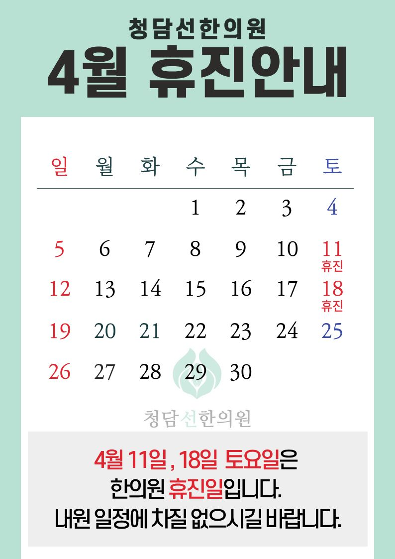 4월 11일(토), 18일(토)은 한의원 사정으로 휴진입니다.