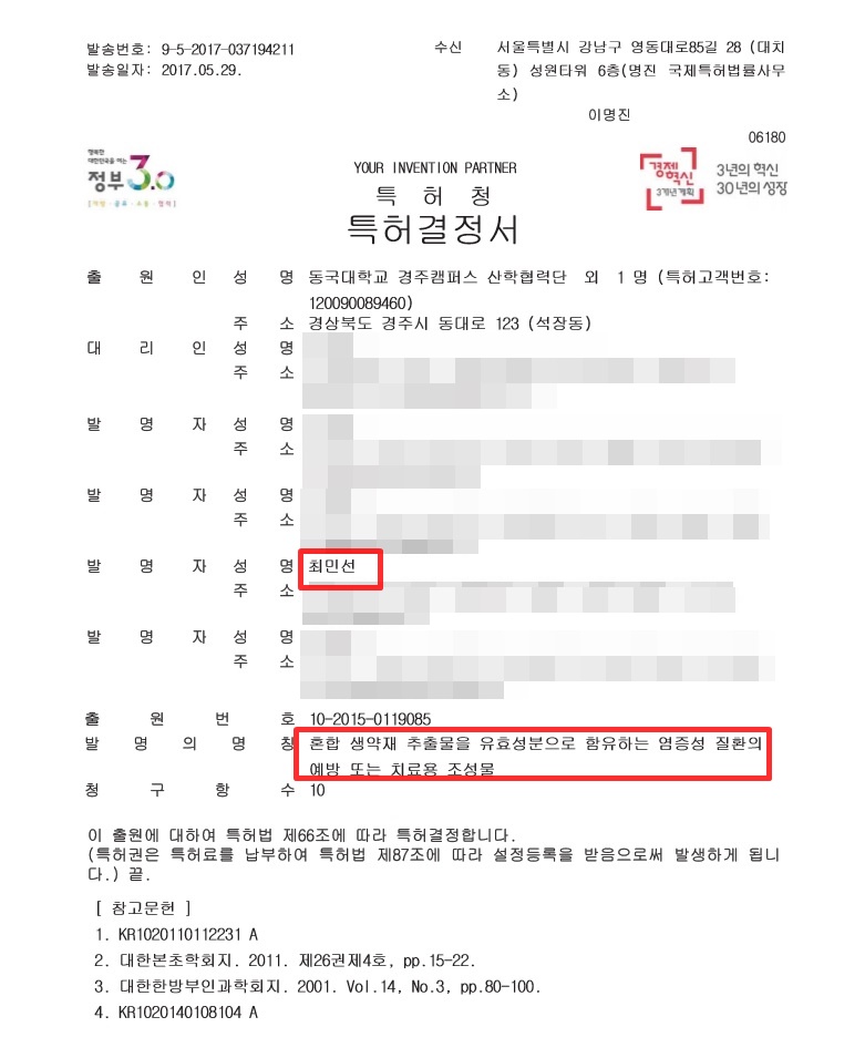 • 최민선 원장 염증성 질환 치료 한약재 특허 출원