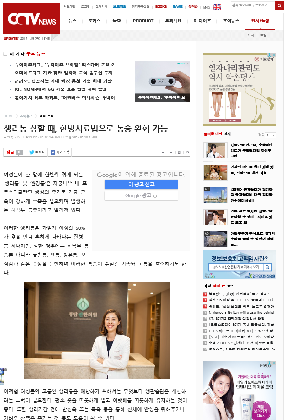 인터넷 뉴스, CCTV뉴스에 생리통의 한방치료에 대한 최민선 원장님 인터뷰 기사가 실렸습니다.