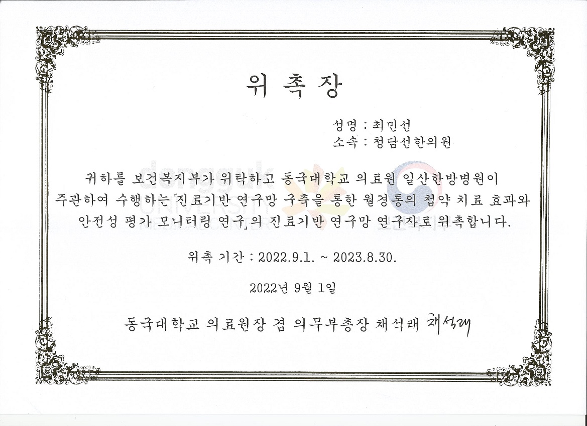 최민선 원장님이 보건복지부 과제인 《월경통의 첩약치료 효과와 안전성 평가 모니터링 연구》의 공동 연구자로 위촉되셨습니다.